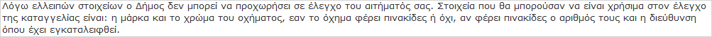 • Λόγω ελλειπών στοιχείων ο Δήμος δεν μπορεί να προχωρήσει σε έλεγχο του αιτήματός σας. Στοιχεία που θα μπορούσαν να είναι χρήσιμα στον έλεγχο της καταγγελίας είναι: η μάρκα και το χρώμα του οχήματος, εαν το όχημα φέρει πινακίδες ή όχι, αν φέρει πινακίδες ο αριθμός τους και η διεύθυνση όπου έχει εγκαταλειφθεί.
