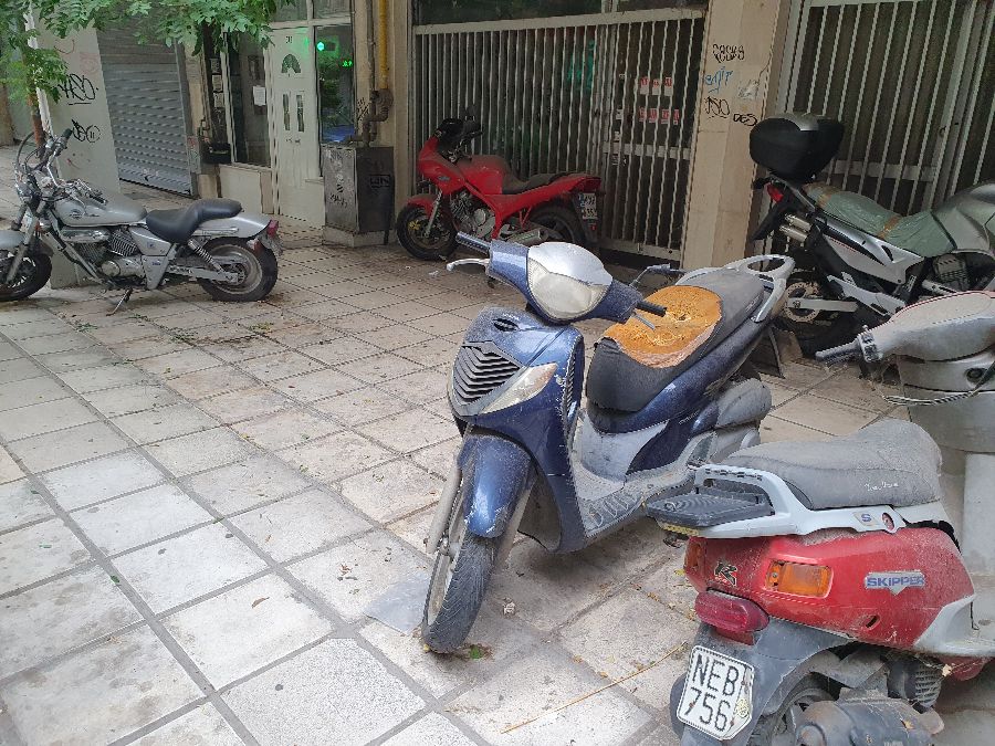 Στην περιοχή γενικά υπάρχουν πολλά παρκαρισμένα μηχανάκια και μηχανές. Τα 6 στις φωτογραφίες είναι εγκαταλελλειμένα πολύ καιρό τώρα. Γεμάτο σκόνη, ιστούς και χωρίς πινακίδες.