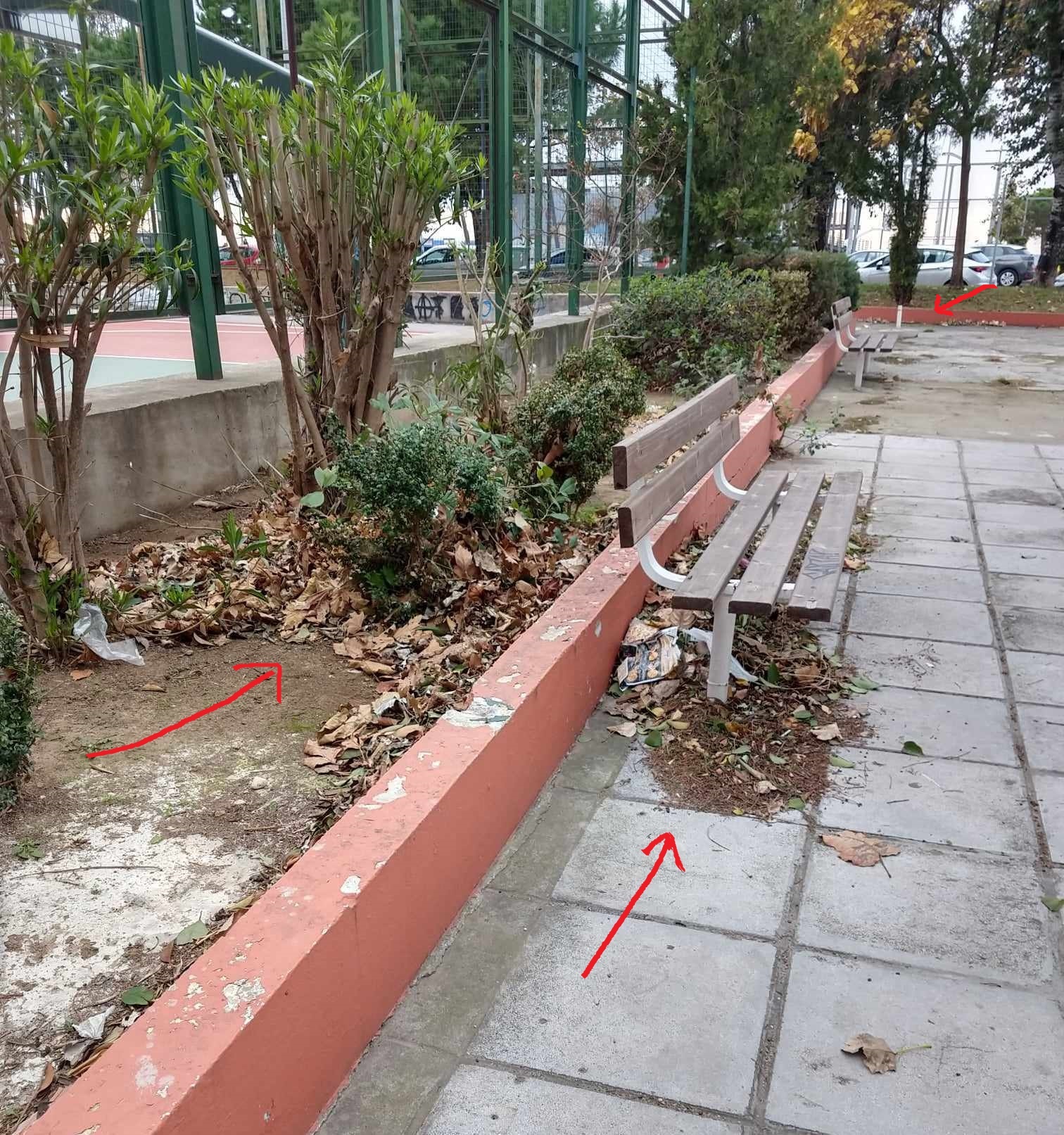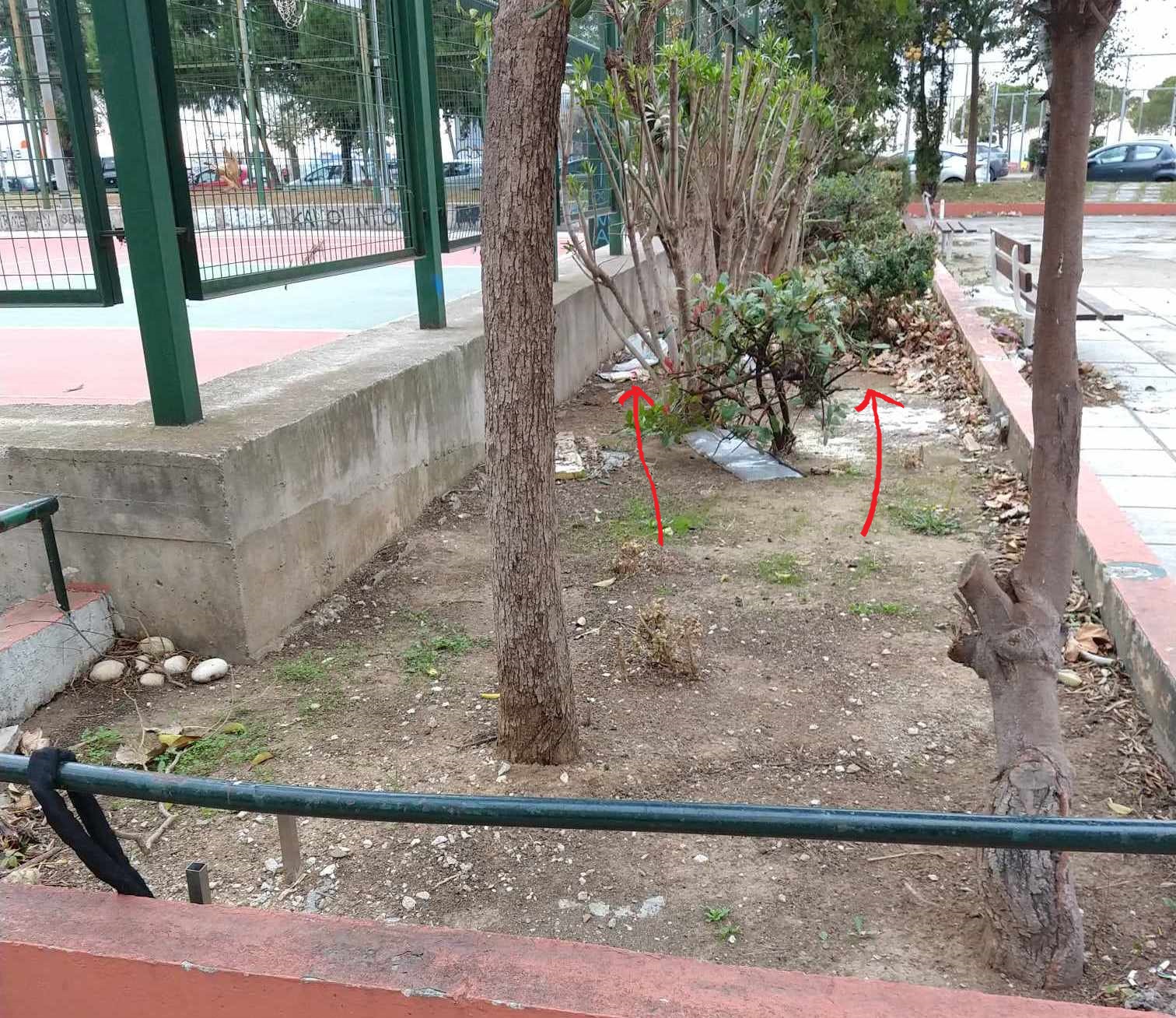 Καλημέρα σας, στην περιοχή Κίμωνος Βόγα 31 δίπλα στο γήπεδο Μπάσκετ α. υπάρχει ένα παρτέρι το οποίο δεν έχει καθαριστεί για πολλούς μήνες από φύλλα δένδρων που έχουν πέσει καθώς και σε παγκάκι που υπάρχει στο ίδιο σημείο, κάτω από αυτό, τα φύλλα έχουν γίνει ¨ένα¨με το πεζοδρόμιο. Επίσης στο ίδιο σημείο στην απέναντι πλευρά υπάρχει ένα κανάλι για το όμβρια ύδατα το οποίο είναι γεμάτο φύλλα. Β. Το πιο σημαντικό όμως είναι ότι στην ίδια περιοχή υπάρχουν τρεις (3) βάσεις μεγάλων ομπρελών τις οποίες χρησιμοποιούσαν οι δύο (2) ταβέρνες που υπήρχαν και έχουν κλείσει εδώ και δύο(2) χρόνια περίπου και εκτός την άνευ λόγου ύπαρξής τους ενέχει μεγάλο κίνδυνο να τραυματιστεί σοβαρά κάποιος αν κατά λάθος πέσει επάνω τους (πόσο μάλλον ένα παιδί).......Παρακαλώ για τις ενέργειές σας ώστε να καθαριστεί ο χώρος από τα φύλλα αλλά κυρίως να απομακρυνθούν οι βάσεις από τον χώρο.Σας ευχαριστώ.