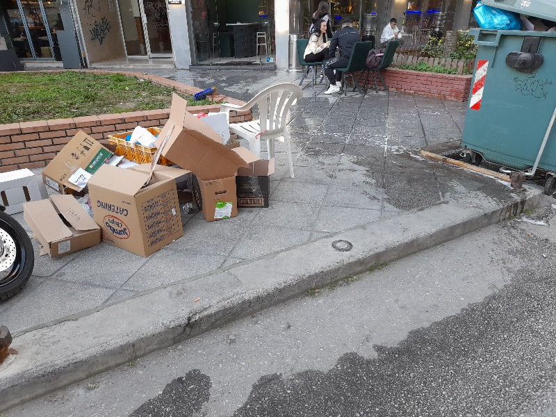 Κοντά στον δρόμο αυτόν δεν υπάρχουν κάδοι ανακύκλωσης και τα καταστήματα αφήνουν κούτες δίπλα σε κοινούς κάδους που όμως δεν μαζεύουν τα απορριμματοφόρα.