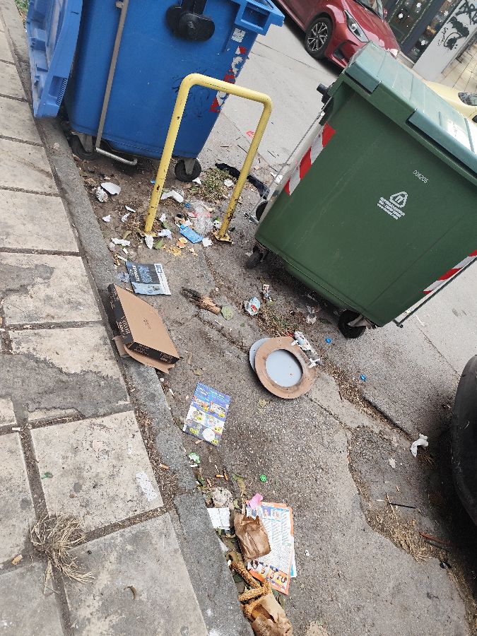Καθαρισμός πεζοδρομίου, κάδων και δρόμου. Το συγκεκριμένο στενό και γύρω από τους κάδους δεν πραγματοποιείται ποτέ καθαρισμός και σκούπισμα. Γίνεται μόνο η αποκομιδή των απορριμμάτων και πάντα μένουν σκουπίδια έξω από τους κάδους.