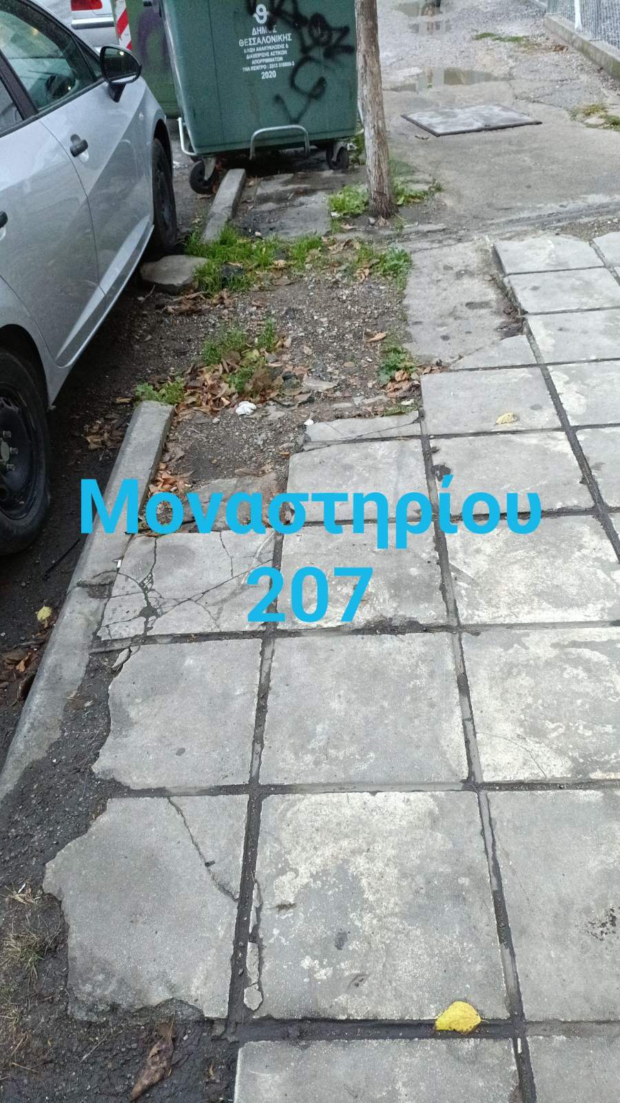 Σημείο χωρίς πλάκες πεζοδρομίου με πέτρες και τούβλα πρόχειρα πεταμένα στο σημείο. Στο κύκλο σας έχω ένα σίδερο που εξέχει. Σπασμένες πλάκες πεζοδρομίου.