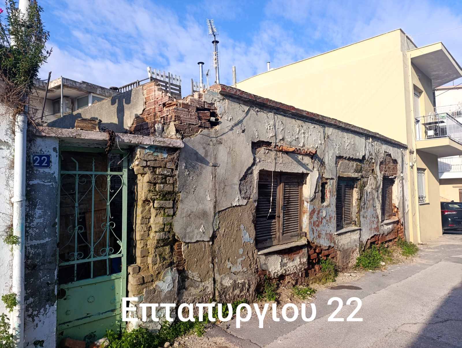 ΣΤΗΝ ΟΔΟ ΕΠΤΑΠΥΡΓΙΟΥ 22, ΥΠΑΡΧΕΙ ΕΝΑ ΕΓΚΑΤΑΛΕΛΕΙΜΜΕΝΟ ΣΠΙΤΙ ΠΟΥ ΠΑΡΟΥΣΙΑΖΕΙ ΕΜΦΑΝΗ ΣΗΜΑΔΙΑ ΕΠΙΚΙΝΔΥΝΟΤΗΤΑΣ, ΓΕΓΟΝΟΣ ΠΟΥ ΕΝΕΧΕΙ ΣΟΒΑΡΟ ΚΙΝΔΥΝΟ ΓΙΑ ΠΕΖΟΥΣ ΚΑΙ ΔΙΕΡΧΟΜΕΝΑ ΟΧΗΜΑΤΑ. ΠΑΡΑΛΑΚΟΥΜΕ ΓΙΑ ΑΥΤΟΨΙΑ ΑΠΟ ΤΙΣ ΑΡΜΟΔΙΕΣ ΑΡΧΕΣ ΓΙΑ ΤΗ ΛΗΨΗ ΠΡΟΒΛΕΠΟΜΕΝΩΝ ΜΕΤΡΩΝ.