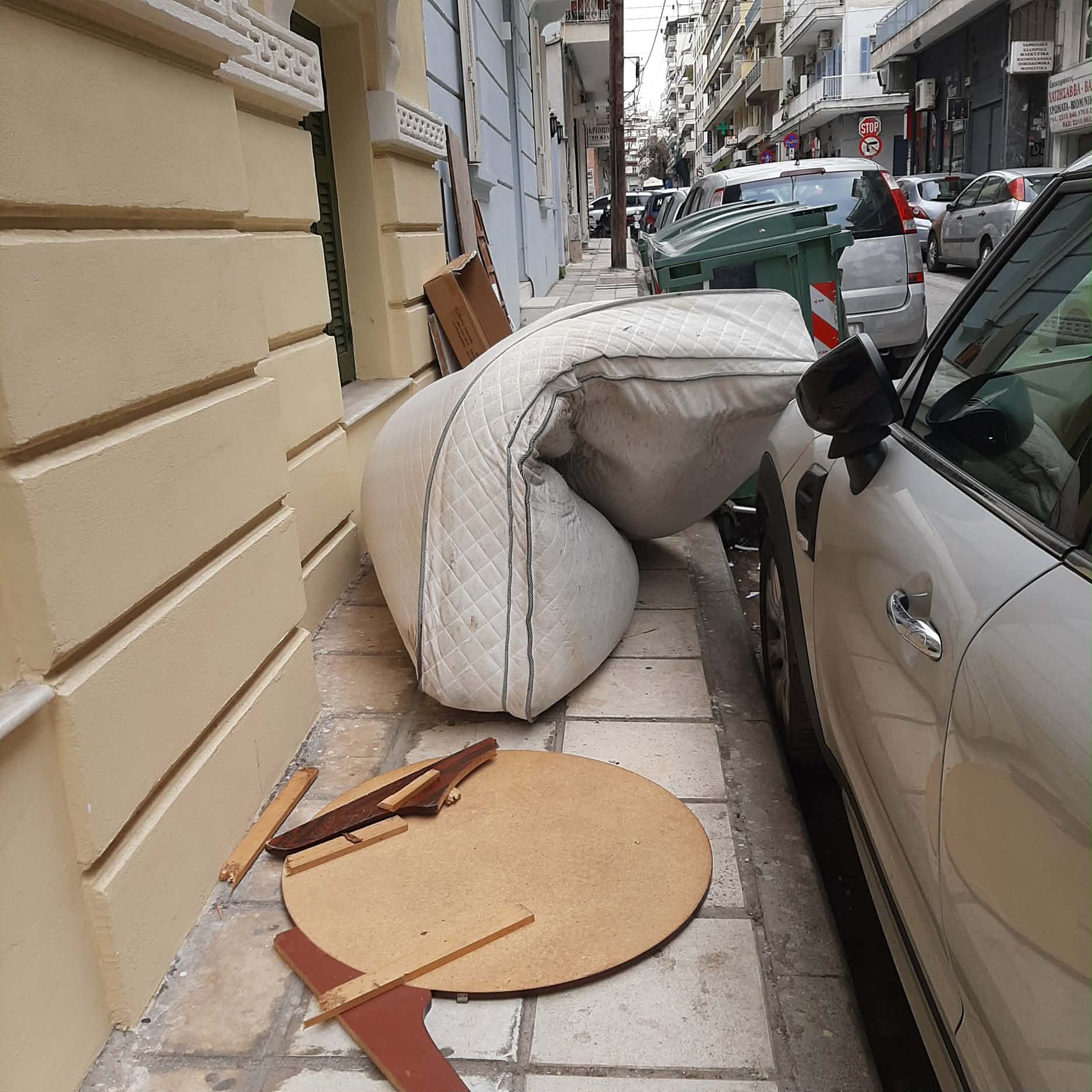 #222907. Στρώμα και διάφορα σκουπίδια μπροστά στα δύο διατηρητέα του δρόμου