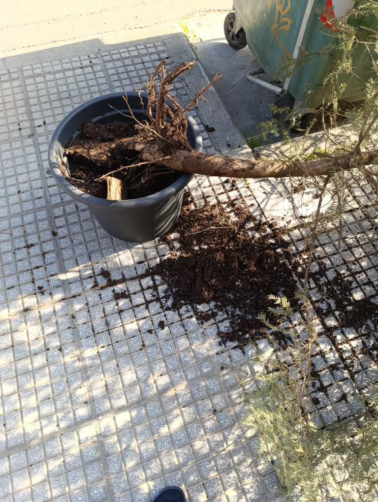 Κάποιος αμόρφωτος πέταξε ζωντανό χριστουγεννιάτικο δέντρο (με ρίζες) διπλα σε κάδο για σκουπίδια στην Τριανδρία, Χαριλάου Τρικούπη 35-36