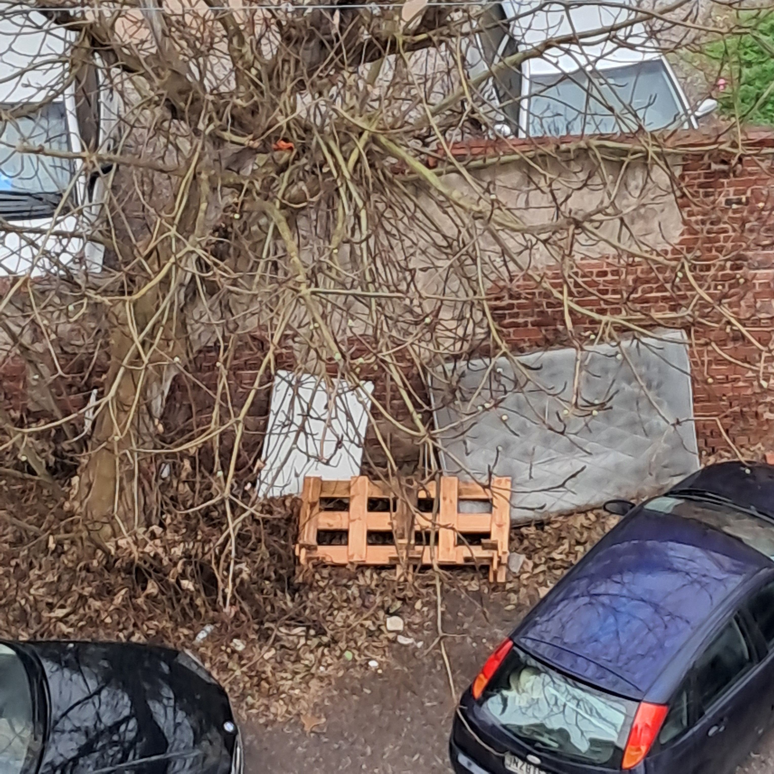 Στρώμα και μισή παλέτα κάτω από τη συκιά