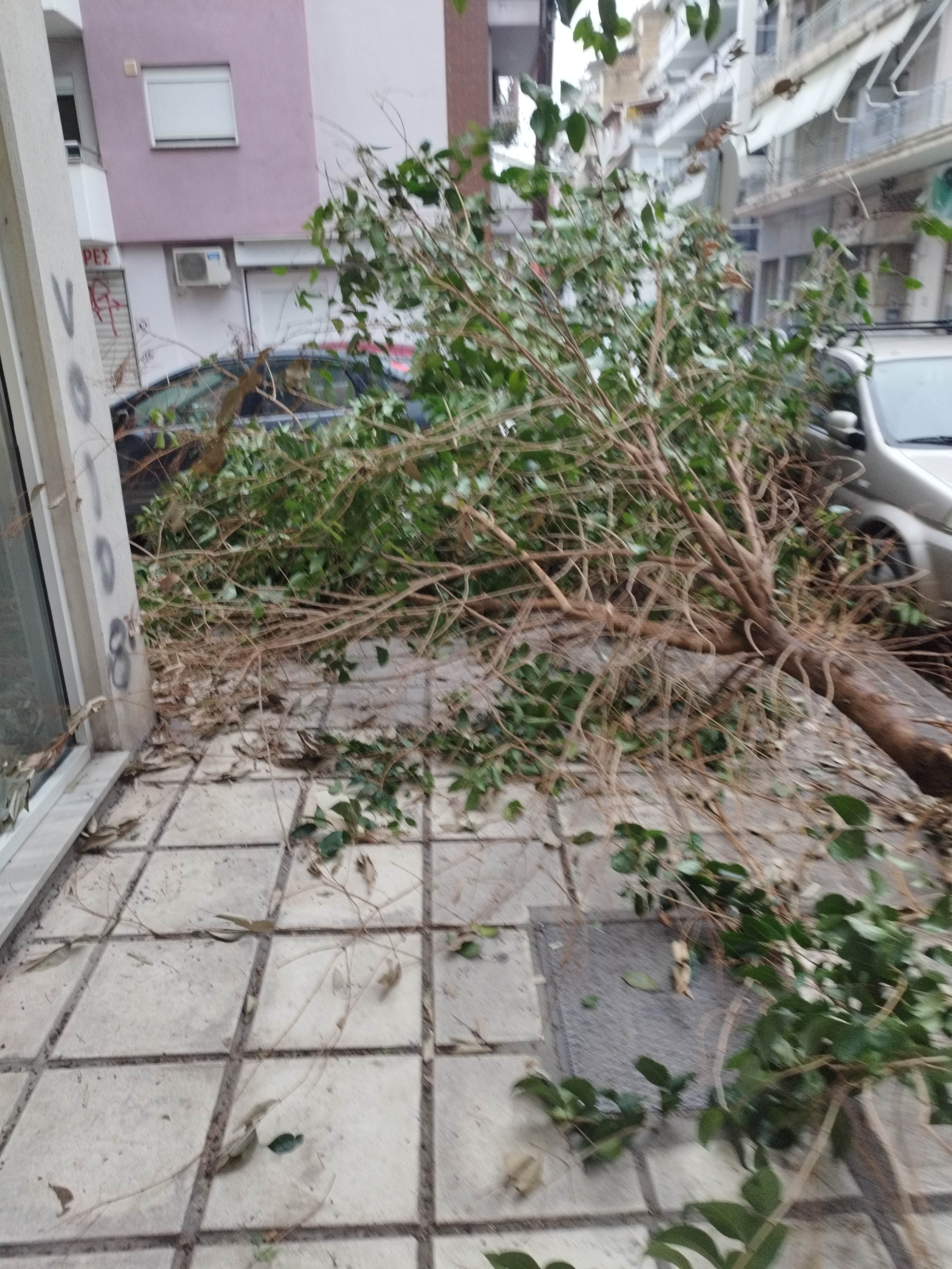 Έχει σπάσει ενα δένδρο και έχει πέσει πάνω σε ενα αυτοκινητο χωρις να έχει προκαλέσει σοβαρές ζημίες εξωτερικά και στο πεζοδρομιο