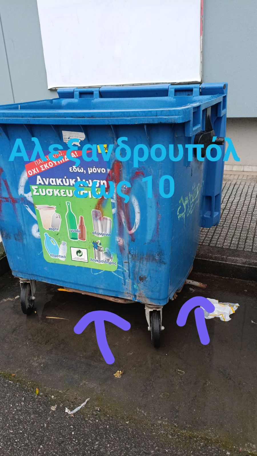 - Καλημέρα σας! Σχετικά με το ανωτέρω θέμα και στο πλαίσιο των αρμοδιοτήτων της Διεύθυνσης Καθαριότητας και Μηχανικών Μέσων σας ενημερώνουμε ότι, ο επόπτης της περιοχής προέβη σε αυτοψία και σε συνεργασία με το συνεργείο της υπηρεσίας μας αντικαταστήσαμε 2 κάδους Ανακύκλωσης . Σας ευχαριστούμε που βελτιώνετε την Πόλη μας.