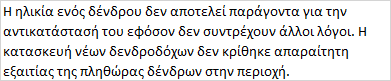 - Η ηλικία ενός δένδρου δεν αποτελεί παράγοντα για την αντικατάστασή του εφόσον δεν συντρέχουν άλλοι λόγοι. Η κατασκευή νέων δενδροδόχων δεν κρίθηκε απαραίτητη εξαιτίας της πληθώρας δένδρων στην περιοχή.