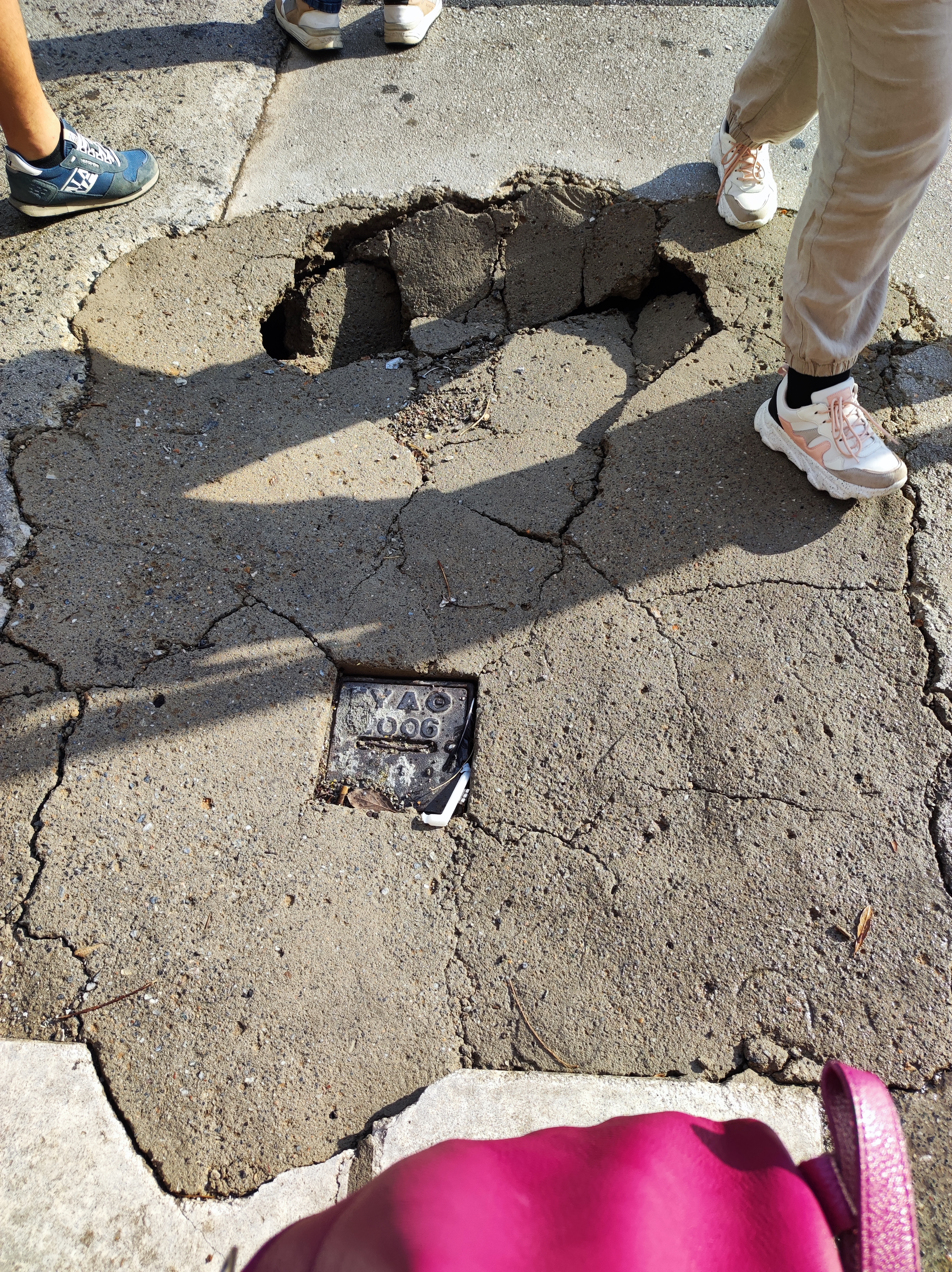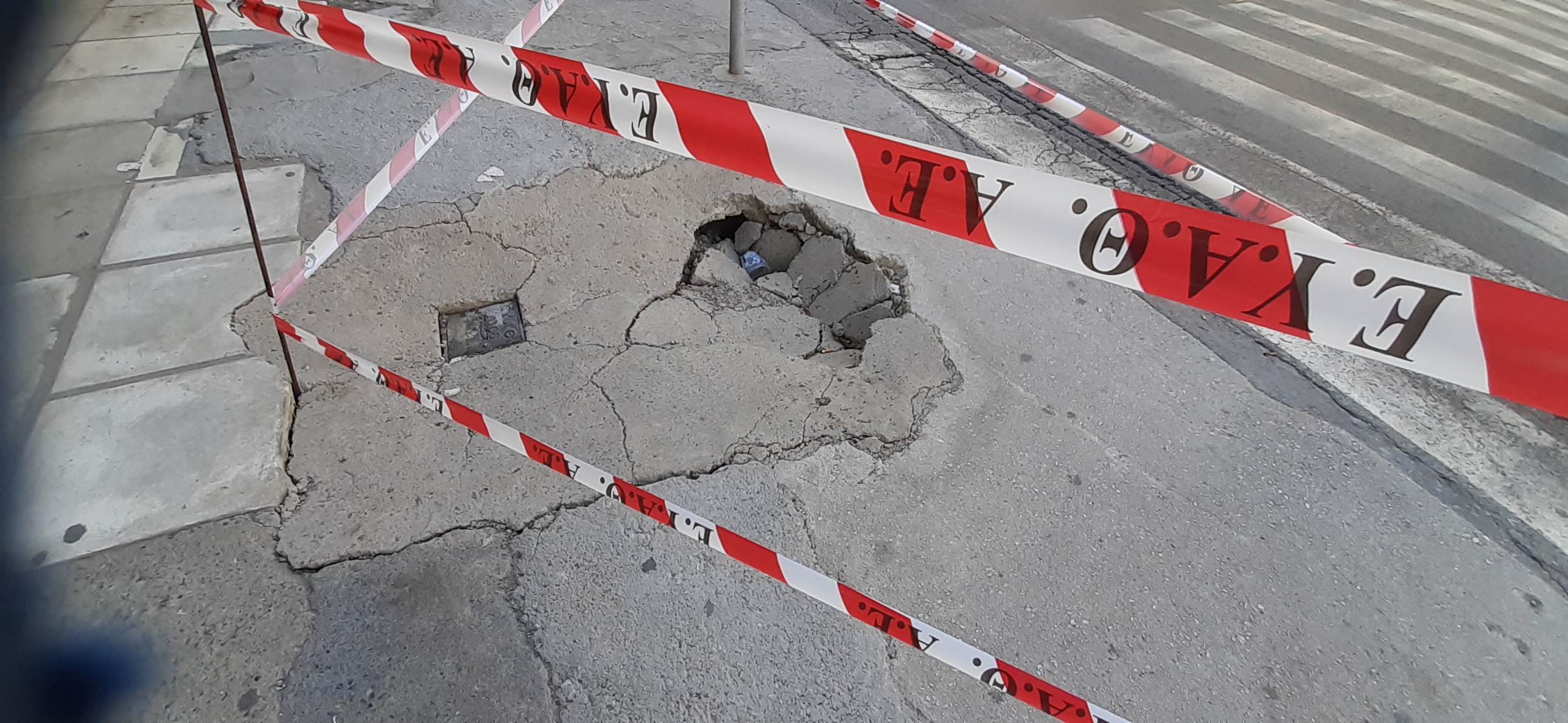 Μετά τη βροχή της Τρίτης 14.06.2022, καταστράφηκε το πεζοδρόμιο μπροστά στη διάβαση και έχει δημιουργηθεί λακκούβα επικίνδυνη για τους πεζούς και τα ΑΜΕΑ. Σημείωση: Είχε γίνει πρόχειρο κλείσιμο μετά από βλάβη της ΕΥΑΘ. Δεν είχαν τοποθετηθεί πλάκες πεζοδρομίου