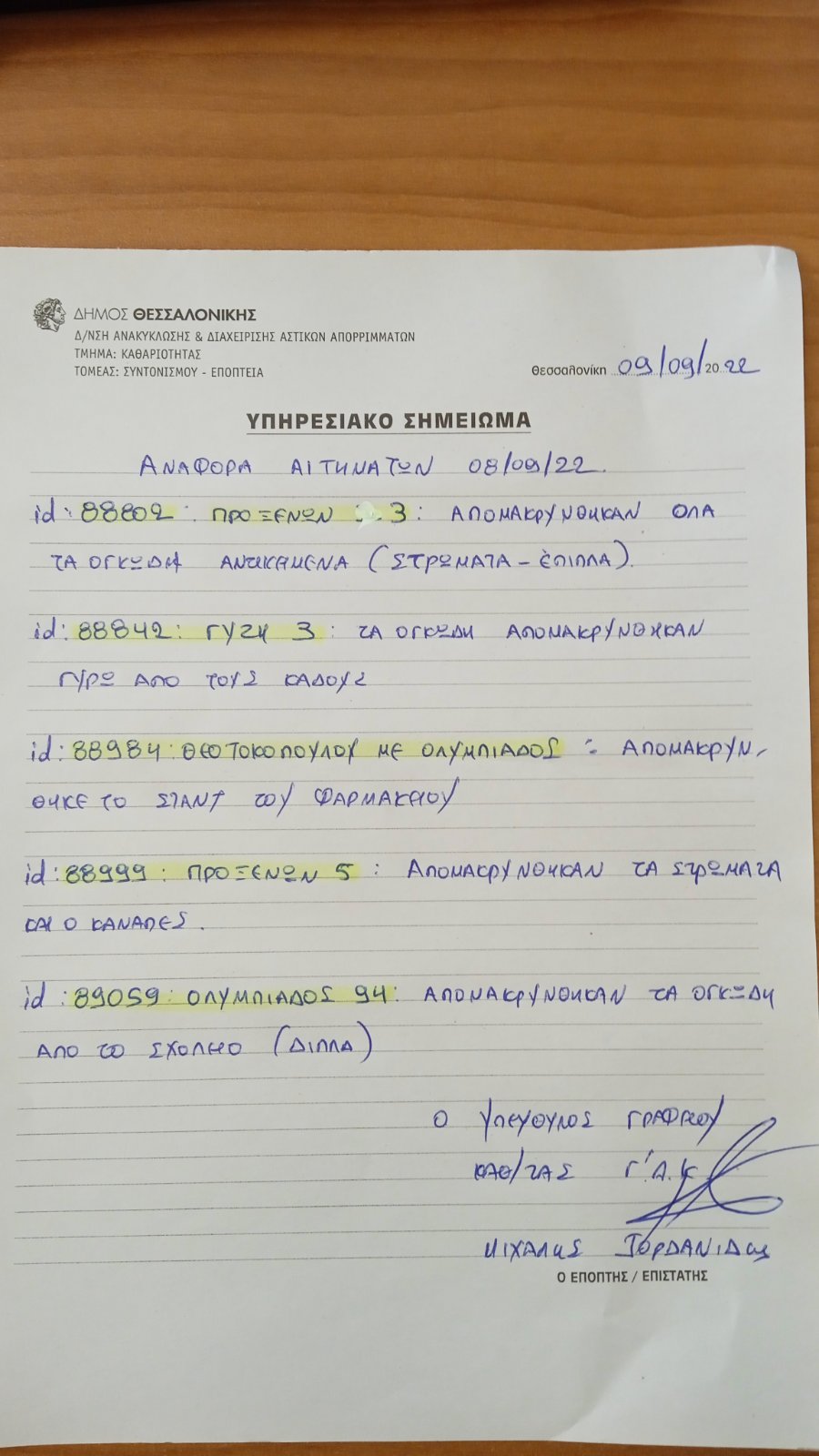 - Σας ενημερώνουμε ότι, έπειτα από αυτοψία του αρμόδιου επόπτη, δύο (2) πράσινοι κάδοι χωρητικότητας 360 λίτρων αντικαταστάθηκαν στις 23/06/2023. Σε περίπτωση που αναφέρεστε σε κάδους απορριμμάτων επί της προαναφερόμενης οδού, σε διαφορετικό αριθμό, μπορείτε να επικοινωνήσετε με το αρμόδιο γραφείο κάδων στα τηλέφωνα: 2313 318740 και 2313 318744.
