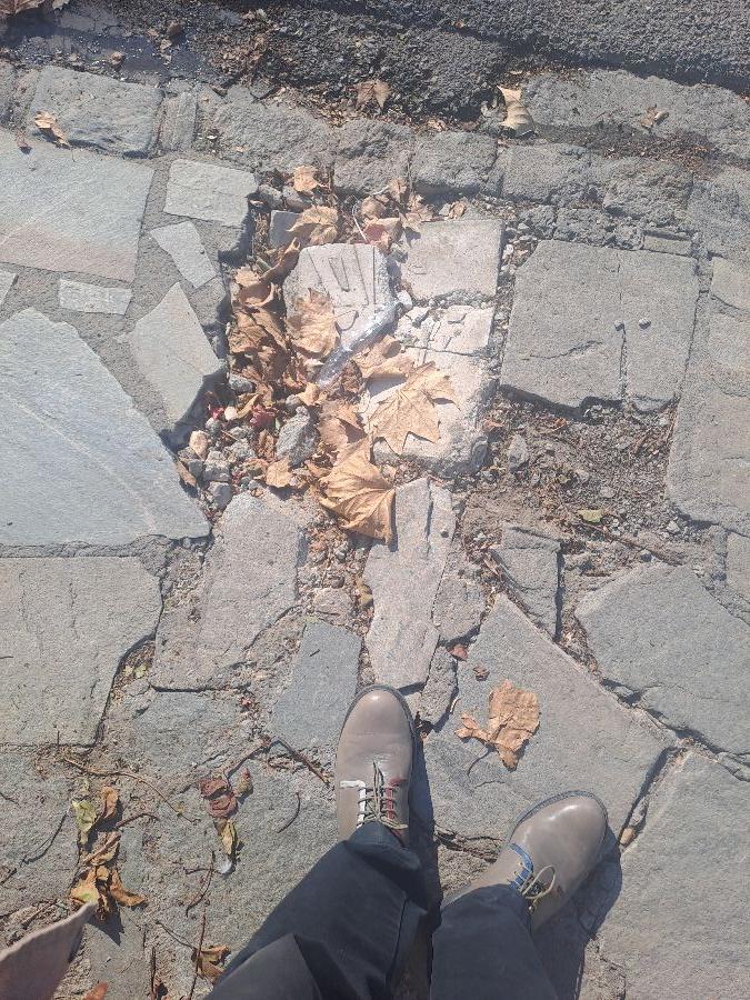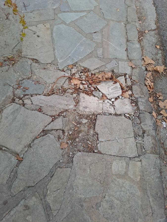 Τα δυο σημεια που φαινονται στις φωτογραφιες στην μεν πρώτη δεν υπαρχει πεζοδρομιο (μονο χωμα), στις άλλες δυο εσπασαν οι πλακες. Η δε μια εξ'αυτών φέρει την επιγραφή ΑΕΡΙΟ.