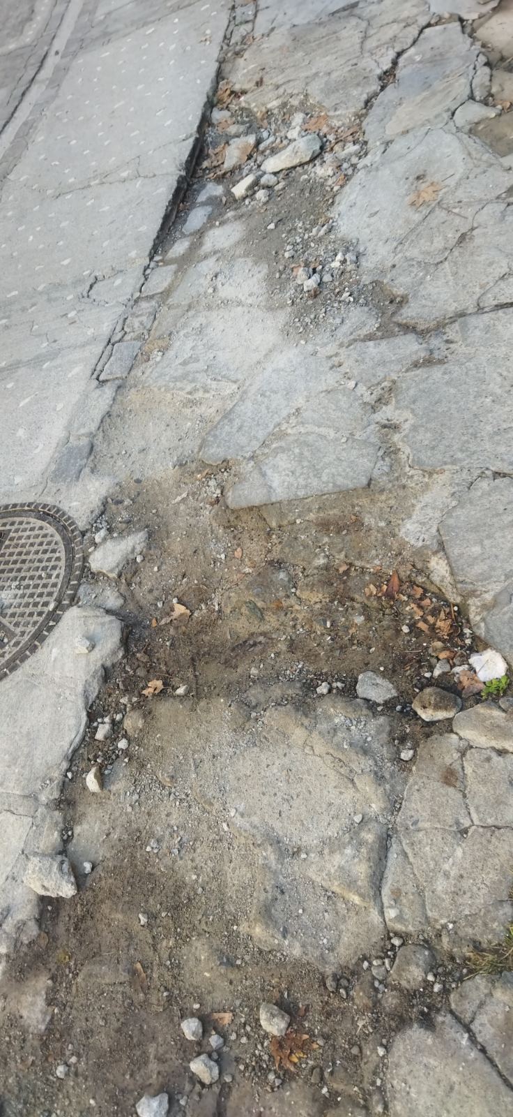 Επί της οδού Φωτίου 11 στην Άνω Πόλη ο δρόμος είναι γεμάτος λακκούβες και ξηλωμένες πλάκες πεζοδρομίου τα οποία καθιστούν τη διέλευση των πεζών επικίνδυνη.