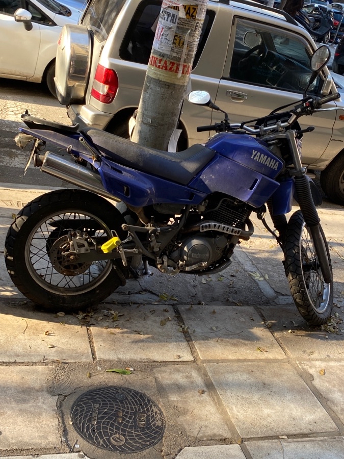 Μπλε μοτοσυκλέτα Yamaha με πινακίδα.