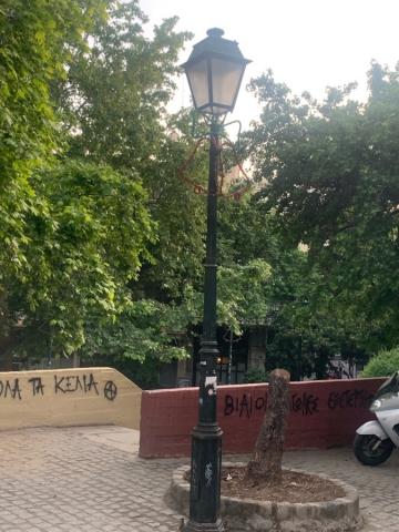 Δεν ανάβει κοντή πράσινη παραδοσιακή λάμπα, στο πάνω μέρος της πλατείας, ακριβώς εκεί που ξεκινούν σκαλάκια.