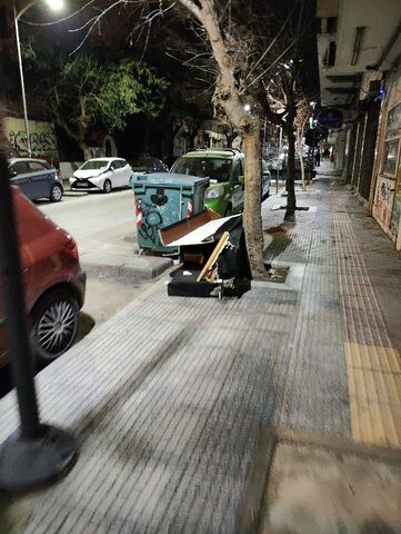 Αναξιμάνδρου 5, έχει δύο κάδους απορριμμάτων και δύο κάδους ανακύκλωσης και από κάτω έχει πολλά σκουπίδια και χώματα πρέπει να γίνει σάρωμα
