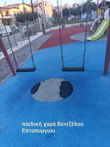 Στη παιδική χαρά που βρίσκεται επί της οδού Γαλοπουλου, νότια της πλατείας Γαλοπουλου έχει αποκολληθεί πλαστικό δάπεδο το οποίο εκθέτει επικίνδυνη τρύπα (βλέπετε σχετικές φωτογραφίες). Παρακαλούμε για την άμεση επισκευή. Παρόμοιες τρύπες βρίσκονται στην ίδια κατάσταση,...