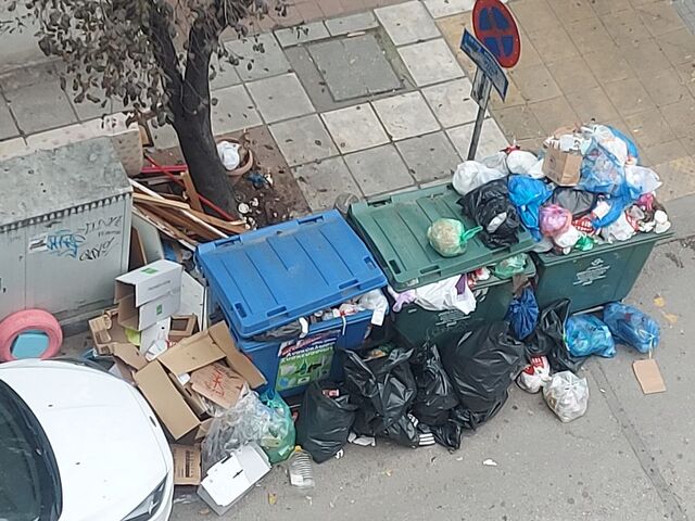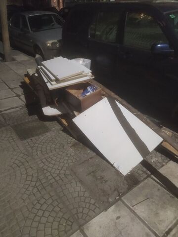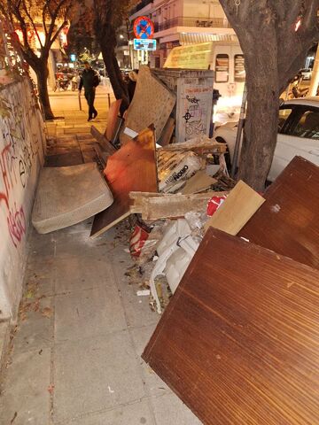 Μπροστά σε Δημοτικό κτήριο, στη γωνία Μάρκου Μπότσαρη με Μαντινείας 30, επικρατεί ένα χάος. Το πεζοδρόμιο είναι απροσπέλαστο λόγω πεταμένων μεγάλων σε όγκο αντικειμένων, συγκεκριμένα κανείς μπορεί να βρει χαρτόκουτα από τηλεοράσεις, ξύλινες καρέκλες, μπιτόνια, καναπέδες...