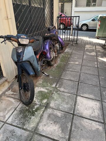 Στην περιοχή γενικά υπάρχουν πολλά παρκαρισμένα μηχανάκια και μηχανές. Τα 6 στις φωτογραφίες είναι εγκαταλελλειμένα πολύ καιρό τώρα. Γεμάτο σκόνη, ιστούς και χωρίς πινακίδες.