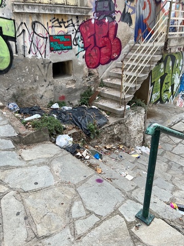 Σκουπιδια σε σκαλοπατια, η κατασταση ειναι τραγικη, ΔΕΝ περναει ΠΟΤΕ ατομο καθαριοτητας να σκουπισει, ειναι σημειο που καθε μερα βρωμιζει λογω τουρισμου και νεολαίας . (καθε μερα περναει ενας απο την καθαριοτητα με ενα μηχανακι παπακι που ΠΟΤΕ δεν τον εχω δει να καθαριζει,...